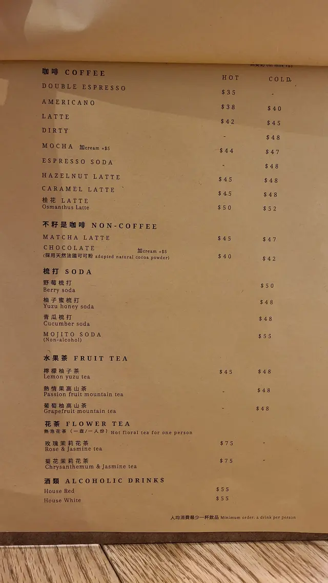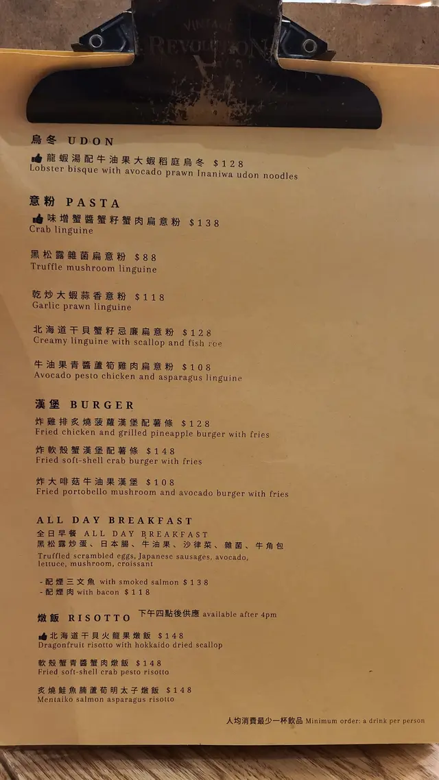 餐牌:主食有新出既漢堡,燉飯,烏冬,意粉,全日早餐,沙律,小食,牛角酥窩夫同甜品。飲品除左咖啡之外,都有茶,朱古力,梳打,花茶,水果茶,酒類。冇加一。