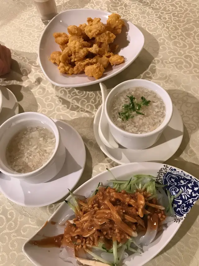 我們三人點了套餐,先來湯羹,不錯的,喝完也撐了肚子一半的空間。再來便是涼菜,雞絲粉皮,表面淋上花生醬,伴了青瓜絲,但就是感覺差了點什麼,對!是麻醬,所以還有進步的空間。