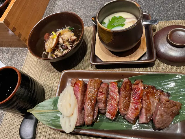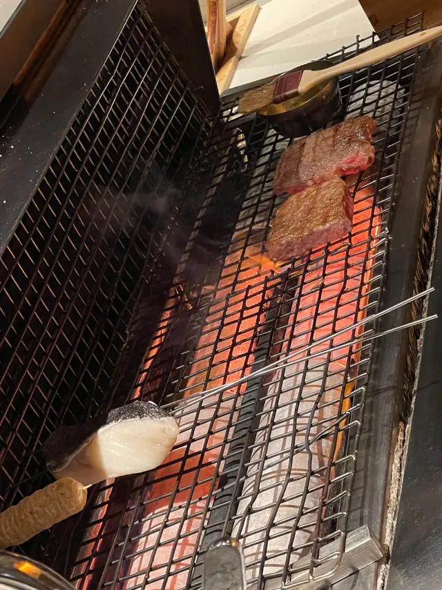 落完order之後,先嚟咗個前菜,有個日式前菜,同埋日式蒸蛋。日式前菜,係啲菇、洋蔥同埋金菇,酸酸甜甜都幾開胃,另外個蒸蛋就比較淡,如果可以濃味少少就更加好!跟住就睇住師傅一路喺度燒和牛,因為我坐吧枱嘅關係,全場可以睇住師傅點樣烹飪,睇住佢點樣燒,之後一步步點樣做,跟住一刀刀咁切,都幾享受!尤其是見到佢燒銀鱈魚,睇到佢好用心喺度燒烤,搞到我下次都想叫銀鱈魚!