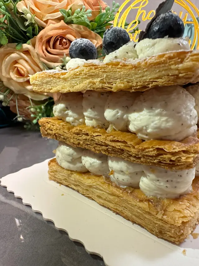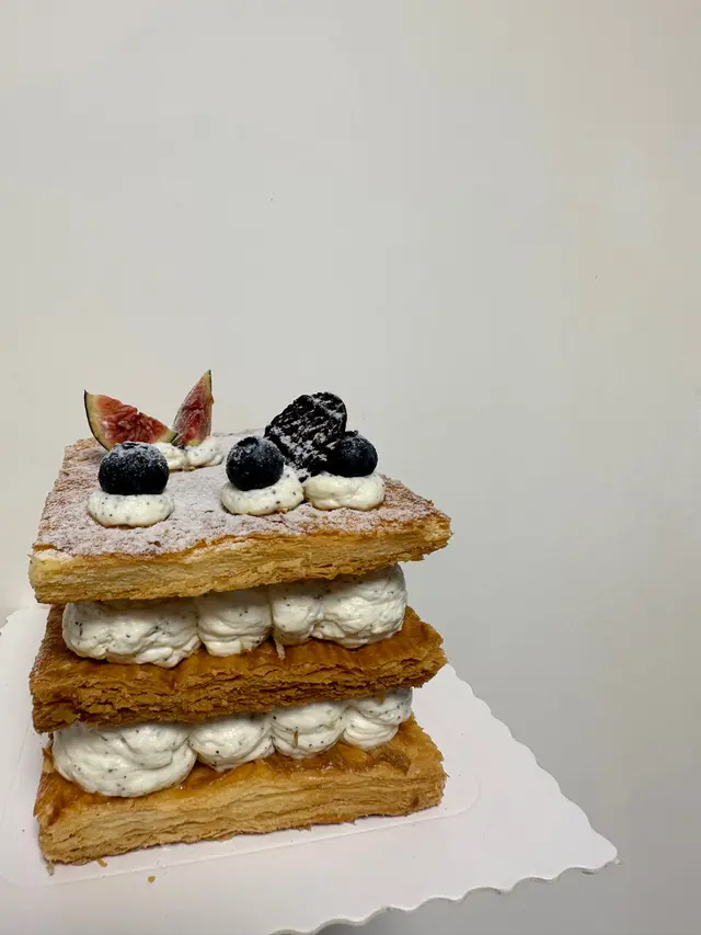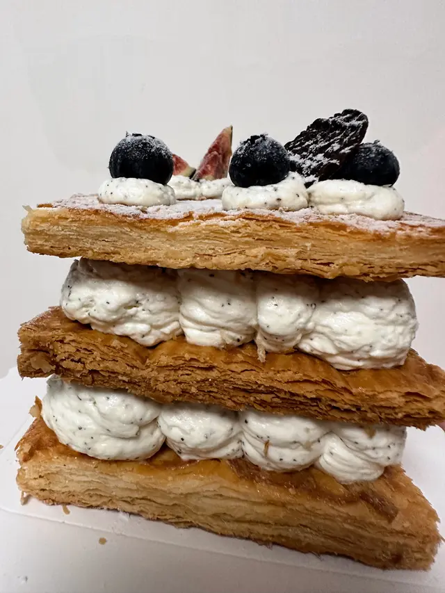 3層酥皮每層都有超過2厘米酥脆厚度,配搭伯爵茶嘅吉士醬、無花果乾點綴。