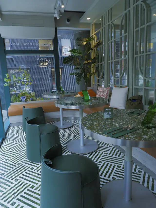 也有另一邊的窗口卡位,淺綠色的枱配藤椅,座位很闊落,坐得舒適,整體裝修以湖水綠、粉白色等淺色系列為主調,風格清新帶亞熱帶風情。