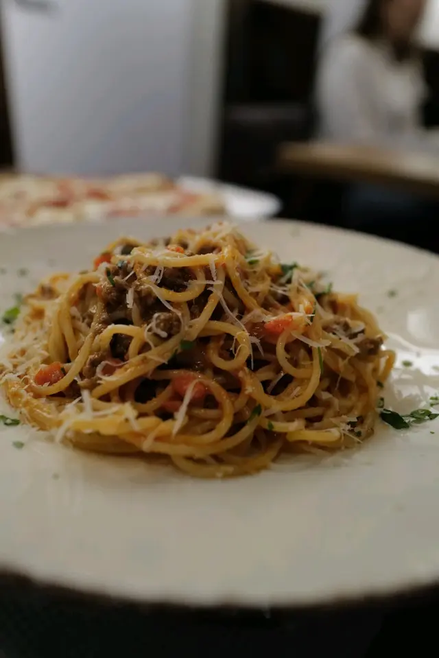 主菜我哋叫咗一個 Pizza Margherita 同一份 Fettuccine Bolognese。Pizza Margherita 嘅餅底厚薄啱啱好…邊位夠脆,芝士香濃,蕃茄醬嘅酸甜味道恰到好處。