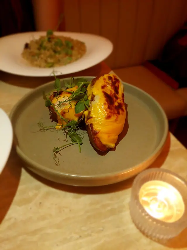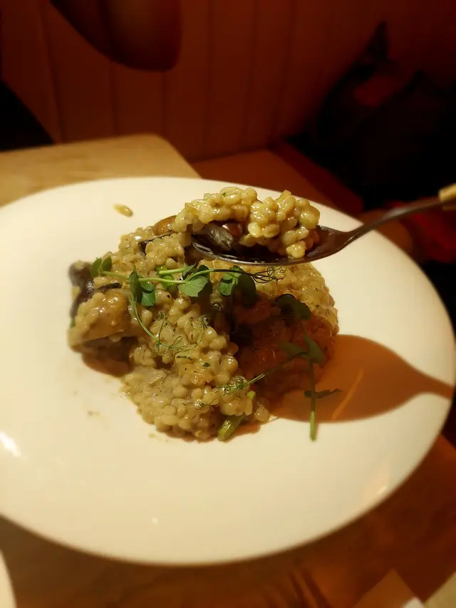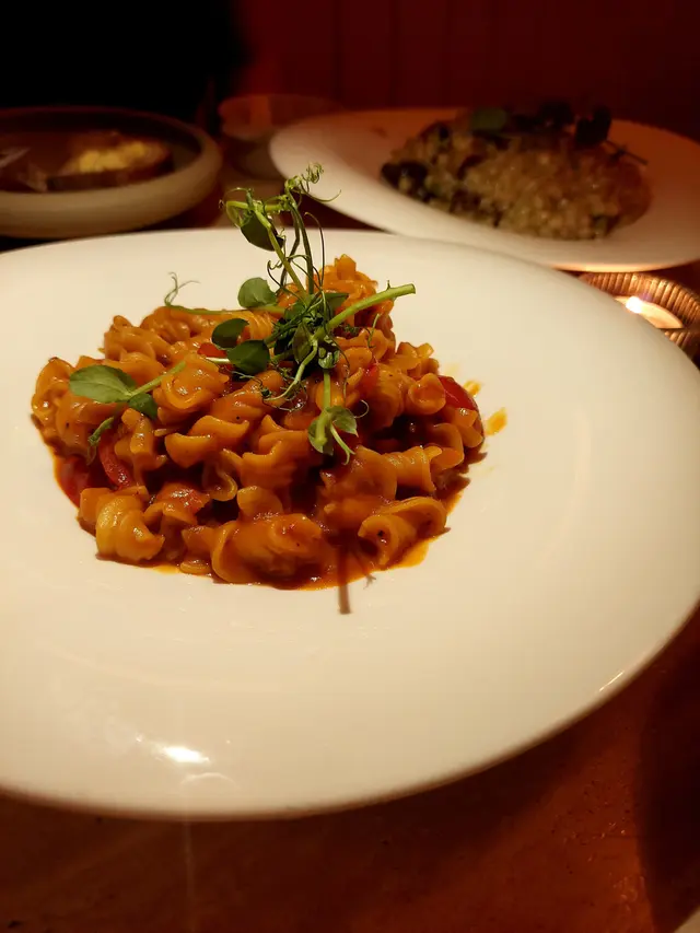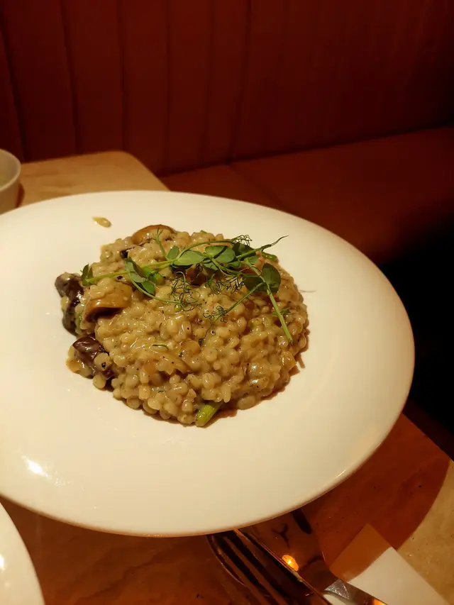 是日品嚐,驚喜連連。烤焗薯仔配挪威三文魚($108) 是道溫暖樸實的開場。薯仔烤得綿密鬆軟,鋪上肥美鮮嫩的挪威三文魚,淡淡的煙燻香氣與薯仔的天然甜味相得益彰,簡單卻見心思。緊接著的香辣番茄羅勒貝殼麵($128) 則完美展現了餐廳主打手工意大利麵的實力。貝殼麵(Fusilli)口感彈牙有嚼勁,裹上以新鮮番茄與羅勒調製的微辣醬汁,酸甜帶勁,風味濃郁飽滿,令人食指大動。另一亮點是奶油蘑菇大麥意大利飯 ($128),有別於傳統Risotto,選用健康的大麥,口感獨特富嚼感。濃郁的奶油醬汁與炒香的蘑菇交融,隱約透出松露香氣,層次豐富而不膩,展現新派餐點創意。
