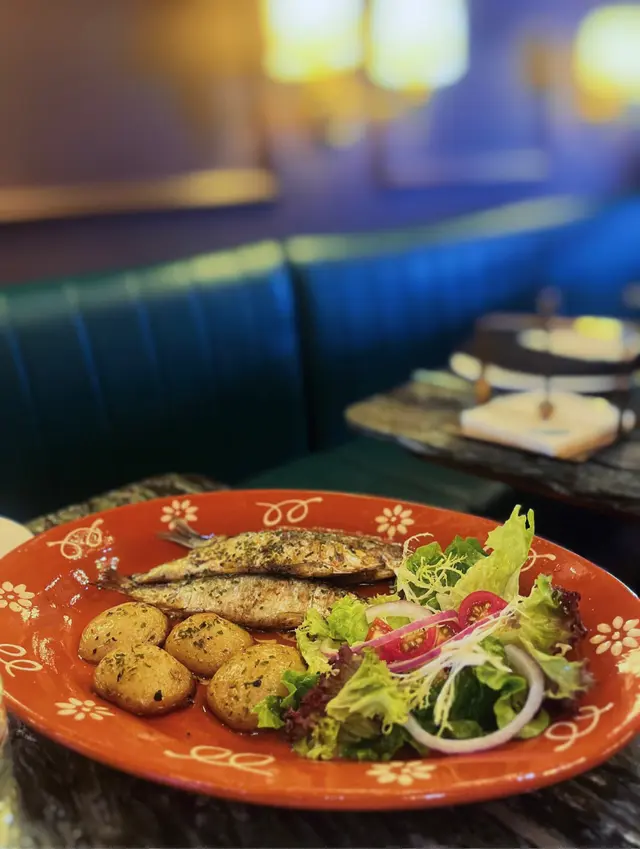 Three perfectly grilled Portuguese sardines are served with boiled young potatoes and a fresh bell pepper salad. The sardines had a delightfully crispy skin and flavorful flesh. This dish may not be for everyone due to the small bones, but it's a tasty and authentic Portuguese preparation.