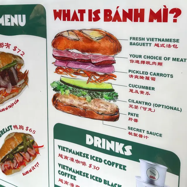 menu夠晒簡單直接,主打就係越南法包Bánh Mì🥖 所有法包基本配搭都一樣🥄 夾滿醃紅白蘿蔔絲🥕 青瓜🥒 芫荽、豬肝醬(靈魂配料✨) 同mayonnaise 。分別只係肉餡料🍖 口味上有統一感但又各有特色😌