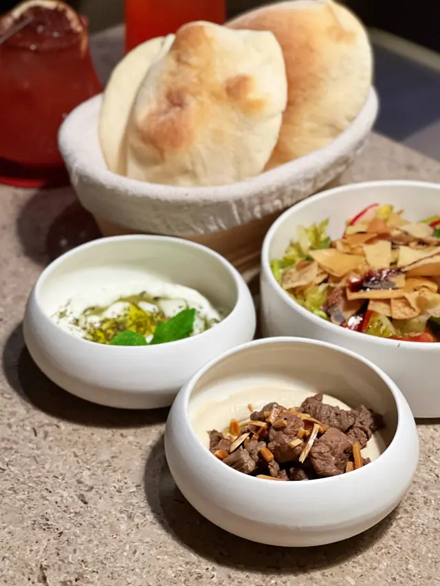 一粒粒香煎牛柳脂肪雖少,但勝在肉味香濃,有綿密細膩的鷹嘴豆泥,有淡淡的甜味,伴黎巴嫩芝麻醬。