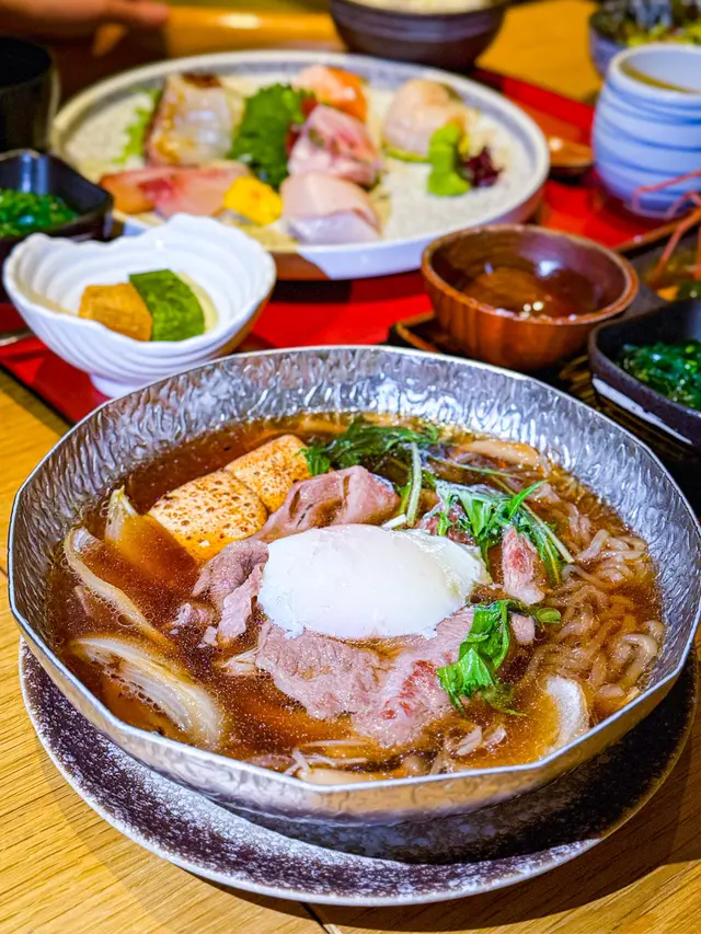 壽喜燒醬香滿滿,A4宮崎和牛很軟滑,肉味亦頗為濃郁!鍋物入面嘅野菜,索滿醬汁同埋和牛油脂嘅精華,配埋溫泉蛋,送飯一流!