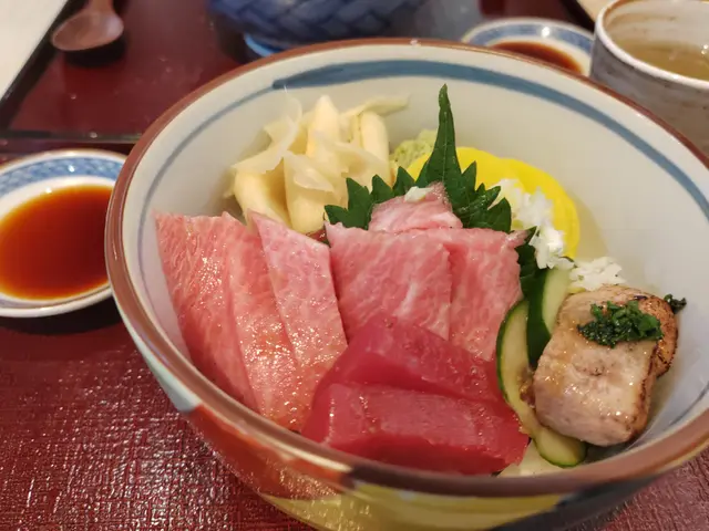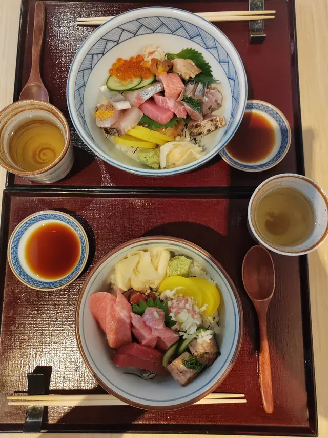 我哋叫咗個特上海鮮丼,一上枱真係哇咗出聲!成座山咁高嘅刺身鋪滿成個碗,完全睇唔到底下嘅飯~有三文魚、吞拿魚、帆立貝、牡丹蝦、三文魚子、海膽...仲有啲唔知咩魚但都好鮮甜!每款刺身都切得厚身,入口即化,鮮味爆棚!