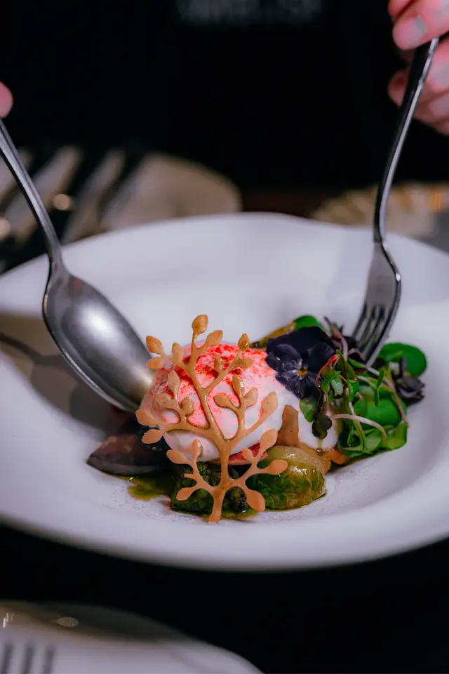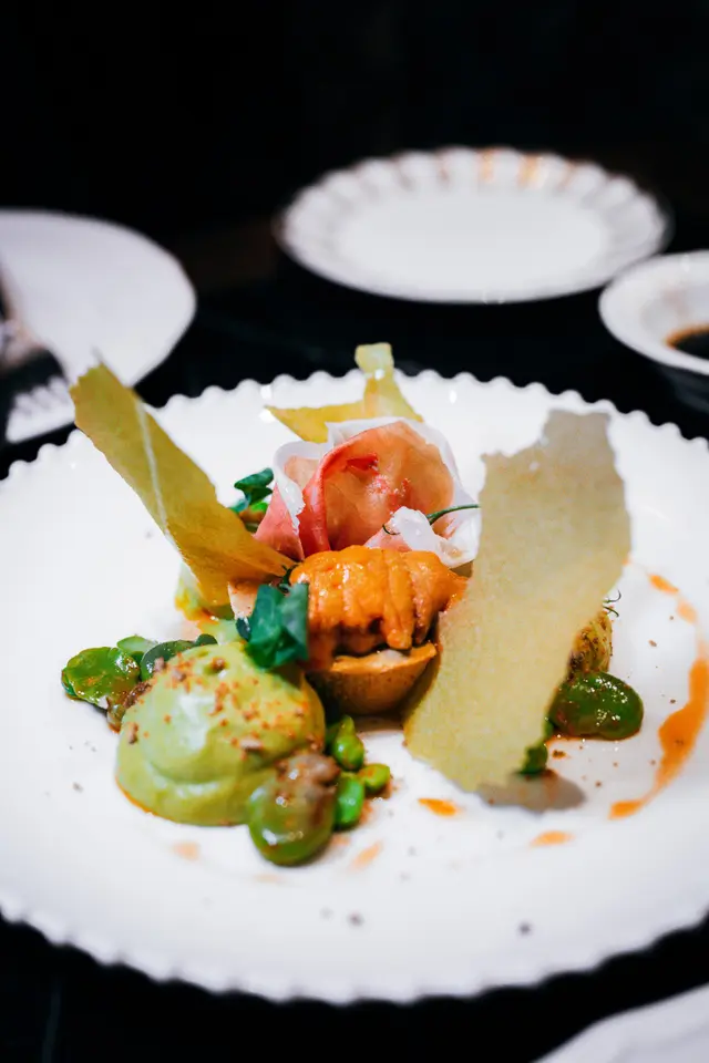 這道菜精緻得像藝術品一樣,原來是以豆類做的沙津為基底慕絲以及忌廉、搭配時令新鮮海膽和帕瑪爾火腿片。海膽的鮮甜與豆類的清新相得益彰,帕瑪爾火腿的鹹香則為整道菜增添了層次感。