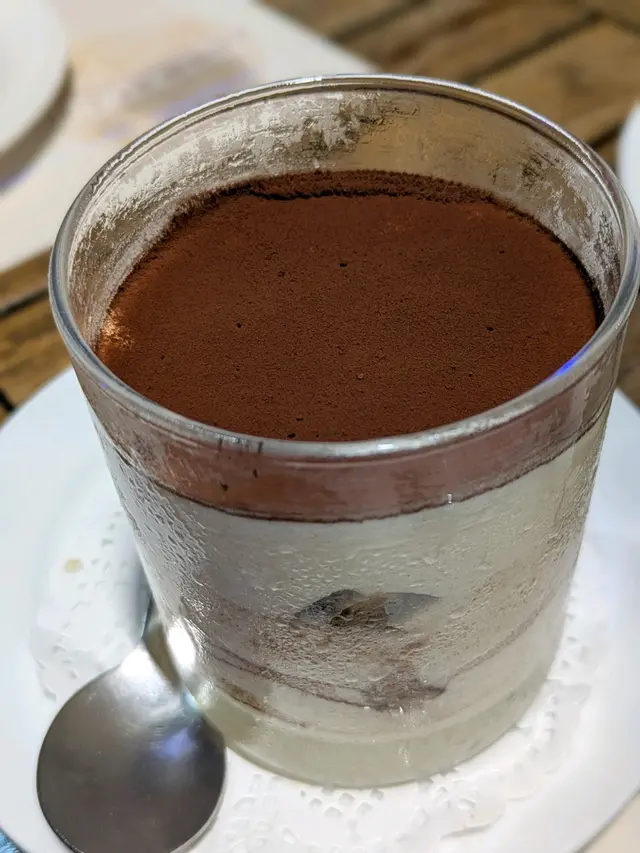 馬斯卡彭芝士的輕盈柔滑、手指餅乾浸滿咖啡軟糯,表層可可粉的微苦可以再多點。
