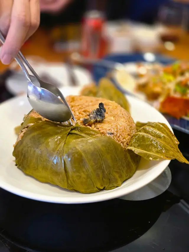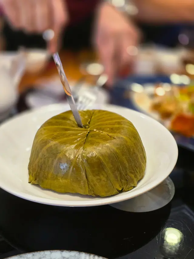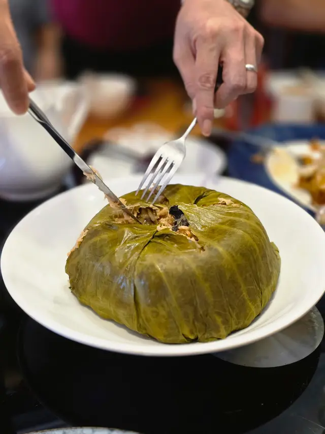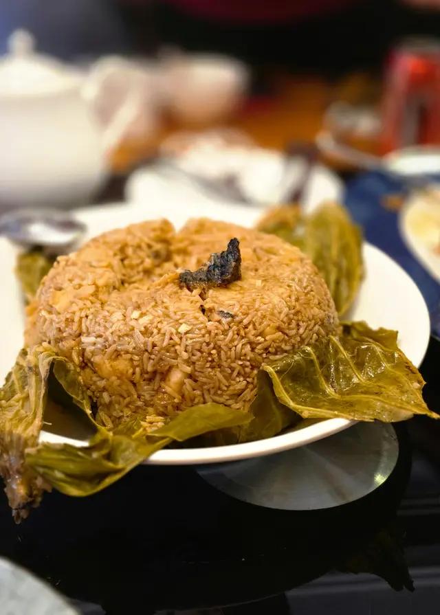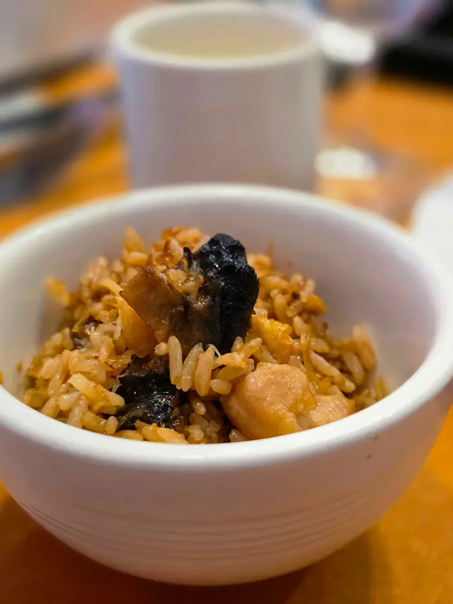 慢慢掀開荷葉,工整的飯面放上一塊鮑魚,提示這並不是從小吃慣的荷葉飯,而是鮑魚瑤柱荷葉飯 HK$298,更要宣布它的荷葉香和超豐盛的鮑魚、蝦粒、肉粒、瑤柱等,譜出超非的荷葉飯美味,100% 俘虜我們的味蕾,好吃得要飛奔月亮!