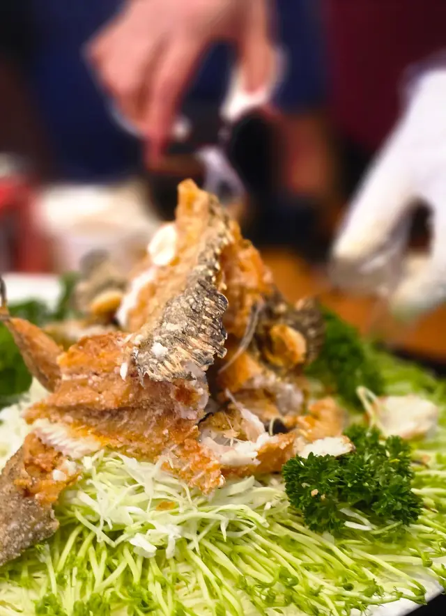 不單瞄準了炸斑塊,炸得美美的原條魚骨,亦是大家焦點所在!經理將炸魚骨剪成小段方便進食,再將小段魚骨砌成一條充滿線條的魚,一下子藝術品就誕生了,令人佩服!