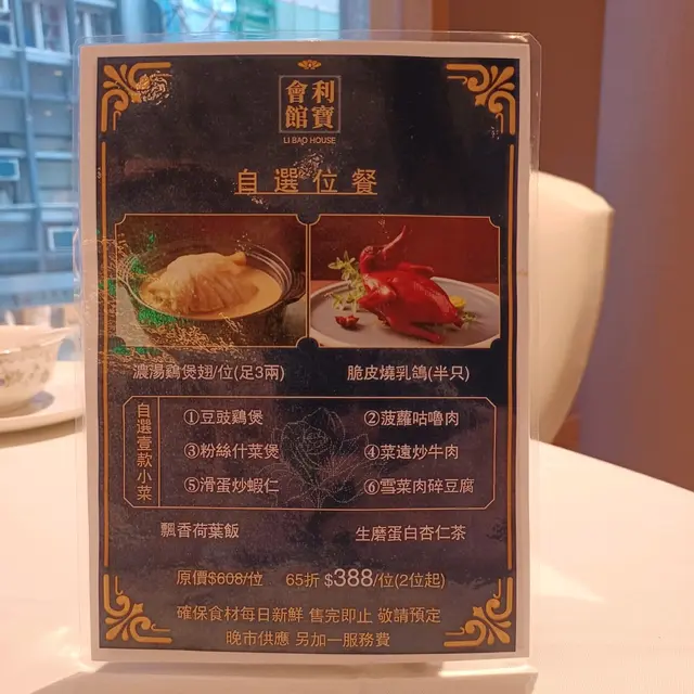 今晚阿SIR請食飯,黎到位於中環德己立街既利寶會館,升降機門一開,就感受到店員熱情嘅招呼。上左茶之後,店員推薦咗2款套餐,那些年懷舊經典菜式(6折$328/位)同濃湯