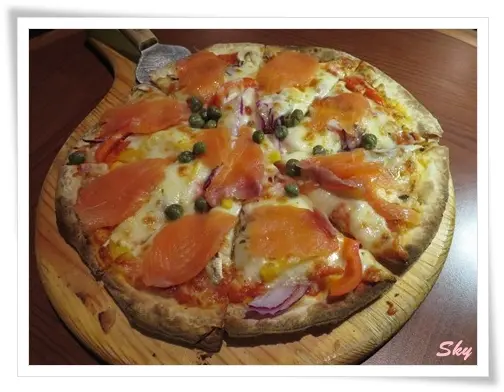 材料主要是煙三文魚, 芝士, 洋蒽和橄欖等.