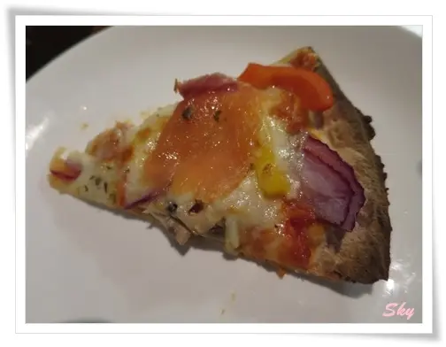 而我就鍾情於薄餅上的半溶芝士, 混入帶咸味的橄欖, 味道幾突出, 兩者也算夾.