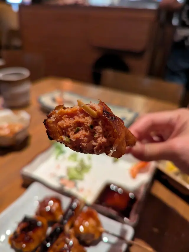 呢個都燒得好靚, 外皮酥脆金黃而肉質柔嫩多汁, 個人鐘意鹽味多過七味明太子. 明太子撈左肉碎釀入雞翼, 取代骨頭, 鹹香微辣.