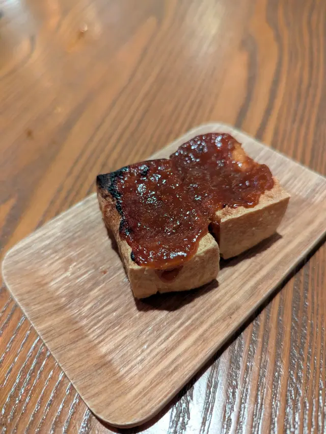 豆腐塗滿味噌醬仲燒到熱辣辣, 外微脆, 好岩做下酒菜