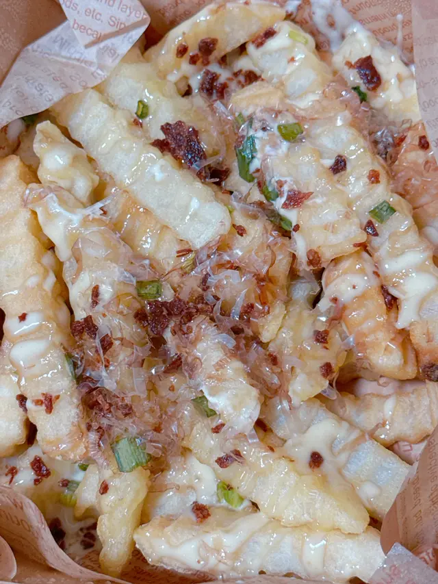 薯條炸得金黃酥脆,外層香脆,內裡軟綿,搭配上日式芥末醬,味道清新而獨特,微辣芥末與香脆薯條形成絕佳搭配。面頭仲撒上木魚絲、蔥花同煙肉,增添層次感。