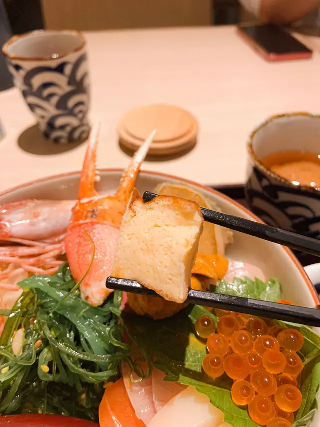 包羅萬有嘅丼,入面有牡丹蝦、海膽、三文魚籽、帶子、蟹鉗、鮑魚、油甘魚同甜蛋😍份量都唔少,丼飯上放到滿一滿😚飯底仲有中華沙律同飯素,保証可以食到一乾二淨😆 刺身方面,魚類柔軟鮮甜冇筋,海膽濃郁唔腥,比較奇怪係甜蛋有啲似濕咗嘅海棉蛋糕,同埋飯壓得有啲實影響口感🤔抵唔抵食見人智喇~
