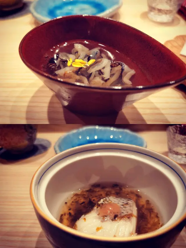 吃到这里师傅给了水母莼菜醋物和慢煮长崎县鲈鱼过了个。这两道就略嫌普普通通。