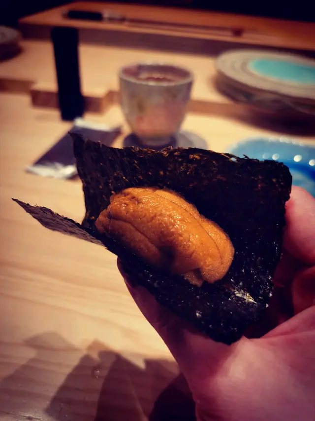 接下去继续寿司,分别有岩手县的石桓贝,烟熏鲭鱼和15日熟成的大腹以及北海道白海胆。石桓贝当季,没啥好说的,鲜甜好吃。烟熏鲭鱼是我喜欢的鱼味重的一道,也好吃。熟成了的大腹感觉油脂更为融合一些,也比较特别。