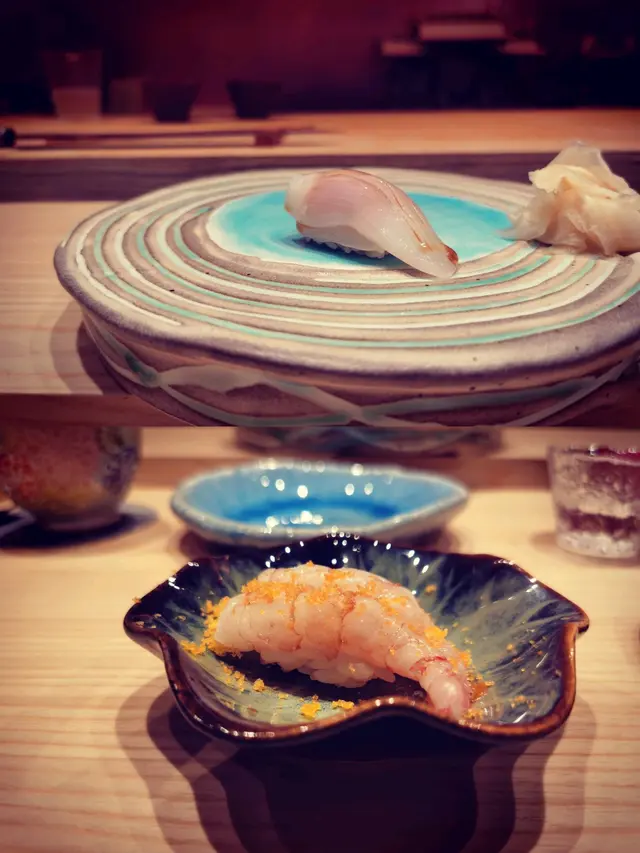 接下去两贯分别是鱿鱼紫海胆和石川甜虾乌鱼籽配虾油。鱿鱼紫海胆是甜上加甜,好吃又很搭。甜虾看的出师傅是有用心设计的,味道丰富又和谐。