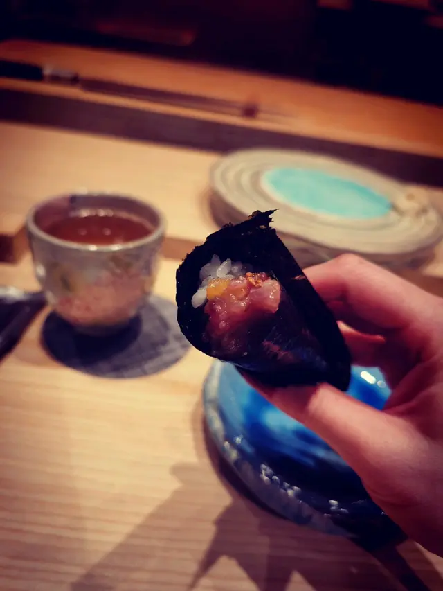 最后是吞拿鱼手卷,贝柱昆布味增汤和甜品收尾。