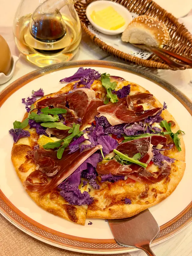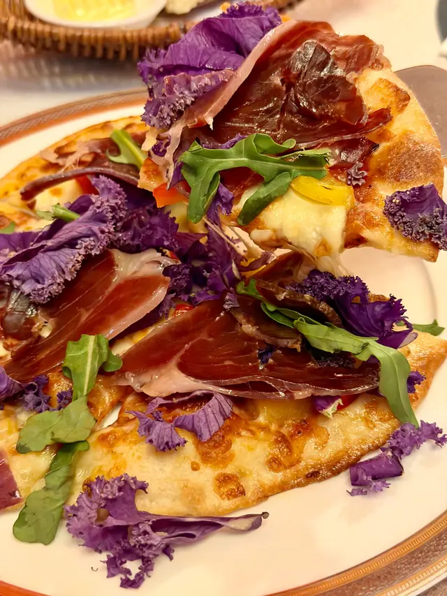 薄脆餅底烘得焦香,搭配鹹香的黑毛豬火腿,增添鹹香風味,輕輕一拉,芝香十足。