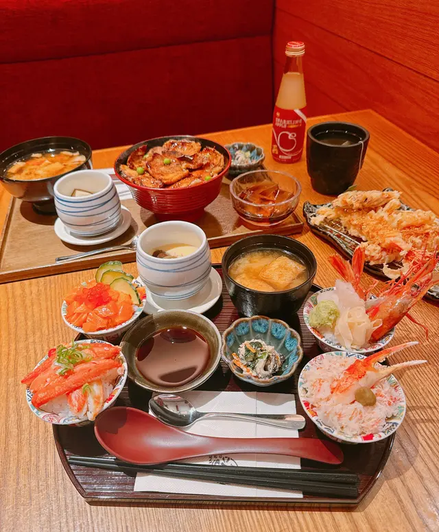 迷你丼以和式擺盤呈上,和式風味的精緻擺盤,打卡一流 ❤️ 配搭時令松葉蟹、油脂豐厚三文魚、三文魚籽同赤海蝦製作四重海鮮丼!大推 🦀 松葉蟹丼,有蟹腳肉丼,又有蟹鉗併蟹肉丼!鮮甜帶有淡淡海水味 🤤 並附上味噌湯、副菜及茶碗蒸,超級豐盛嘅海鮮全席!十分適合女孩子細細的胃口,又可以享受多款滋味 💖 另外 +$28 追加青森蘋果梳打,酸酸甜甜更開胃~