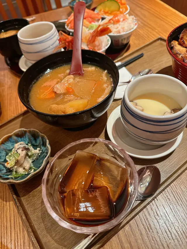 豚丼以北海道豚肉(KAMIKOMI豚)的肉眼製作,沾上八十年歷史的秘製祖傳醬汁後再現烤熟 🥩 醬汁甘甜帶點胡椒味,米飯圓身粒粒飽滿,👦🏻專登叫咗半熟蛋天婦羅拌飯,配上醬汁撈飯絕配;另外 +$33 追加豚肉味噌湯定食 🥗 十分豐盛的晚餐!