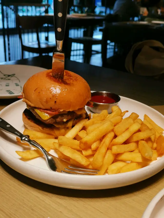 牛肉漢堡包嘅牛就爆汁,再配埋旁邊嘅薯條好邪惡,非常滿足的午餐