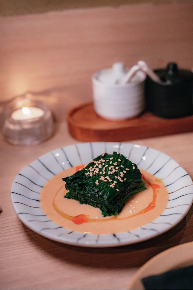 居酒屋主打,前菜、關東煮、炸物、串燒,主食等,如果唔想諗仲可以揀交由廚師發辦。每個種類揀左幾款試下。先來前菜有醬燒平目裙邊,燒得香口,帶點焦脆;而麻醬涼拌菠菜清爽開胃。