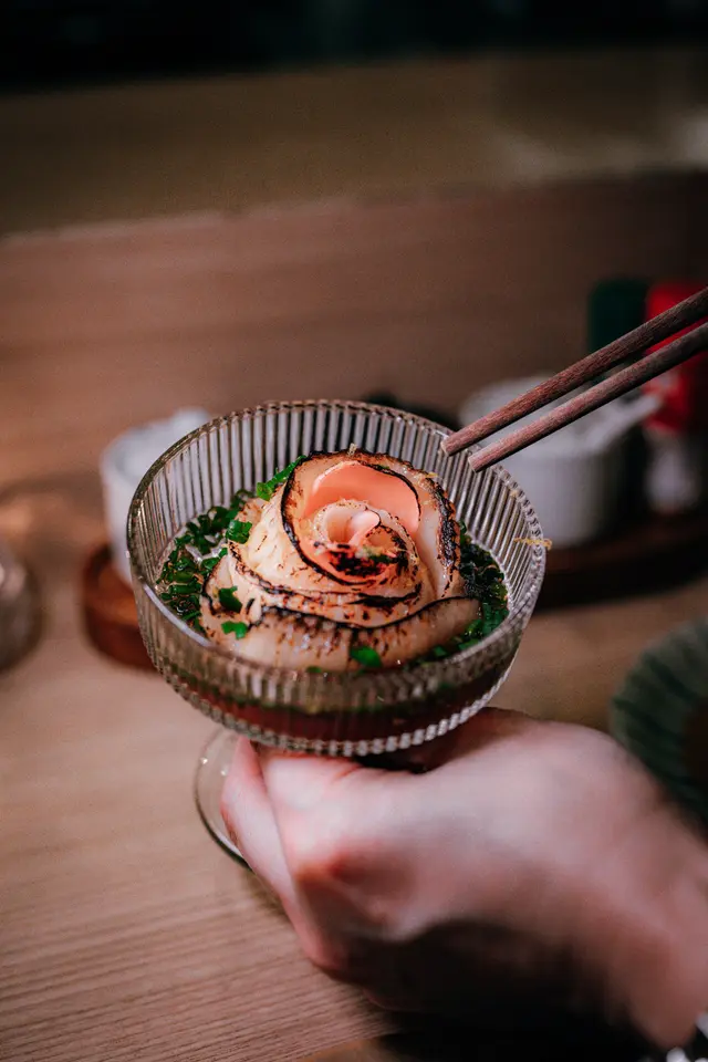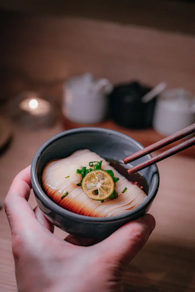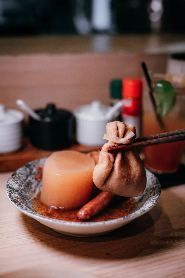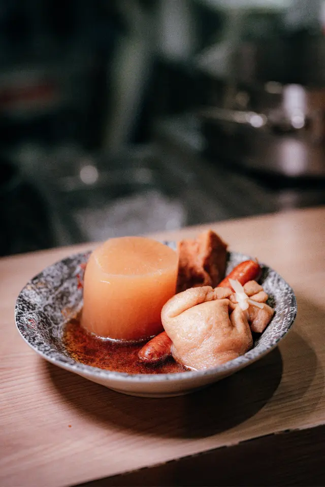 燒物既關東煮可以逐款點選,蘿蔔清甜入味,油豆腐吸滿湯汁,煙燻小香腸帶點咬口,福袋則內藏驚喜。