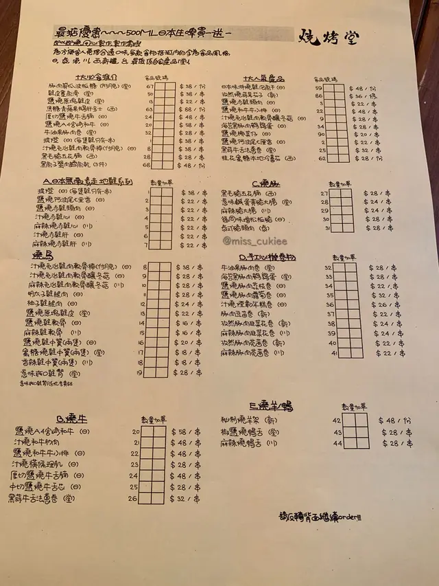 點餐紙上,2面都寫滿晒,有104款串燒,真係超多選擇!我哋點咗啲想食嘅串燒。以下係我嘅好食排名😋