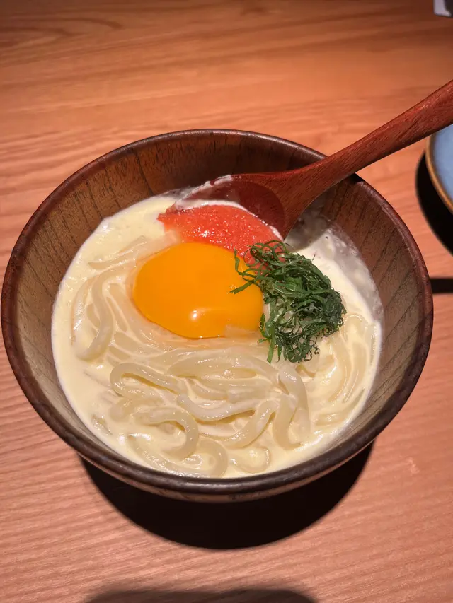 日式烏冬麵搭配濃郁的明太子奶油醬,口感滑順,鹹香鮮美,是一道融合日式風味的佳餚。