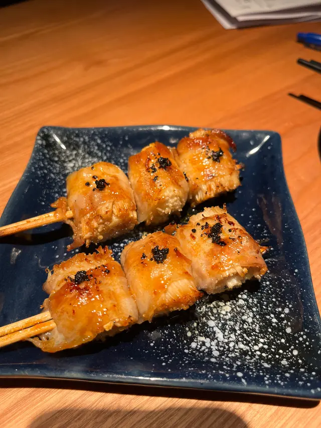 雞中翼用鹽調味後炭火烤製,外酥內嫩,鹽味提鮮,是宵夜或聚餐的熱門選擇。