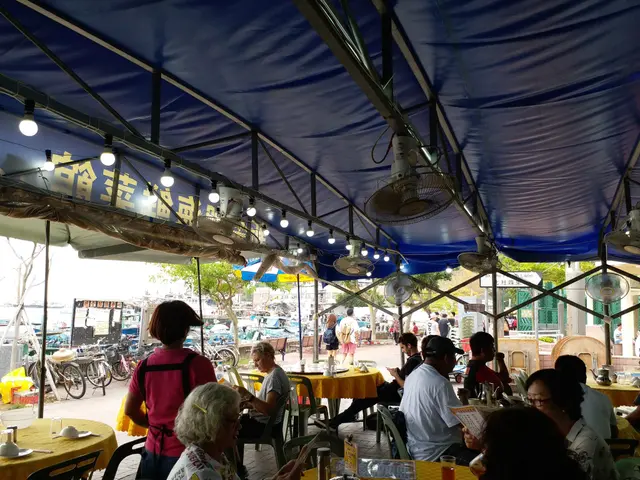 碼頭沿岸,有多家海鮮餐館,都是在路邊設置枱椅,搭起帳篷遮住陽光。