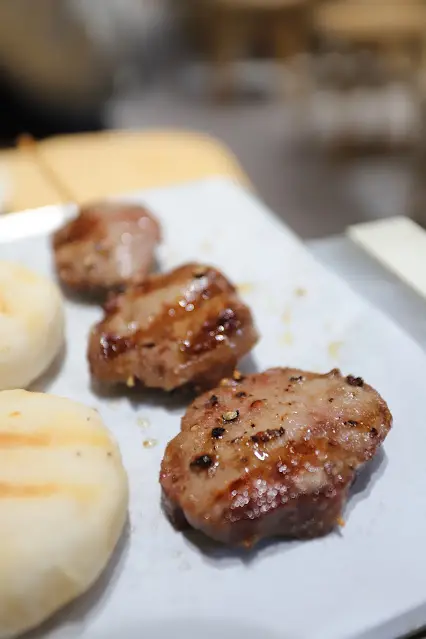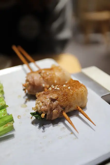 烤五花肉卷」($28/串)的五花肉雖不太肥,但油潤而帶脂香,味道還不錯。