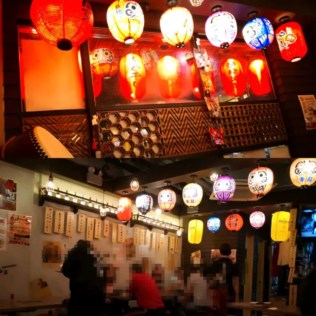 燈光、氣氛、坐的木桌椅全都有居酒屋的感覺。我比較在意那兩排達摩紙燈籠,好可愛呢!