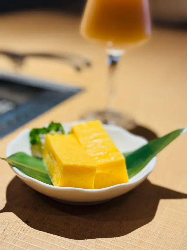 厚燒玉子蛋色澤金黃,口感綿密而富彈性,微甜的蛋香在口中緩緩散開,與燒和牛相輔相成,中和油膩感。