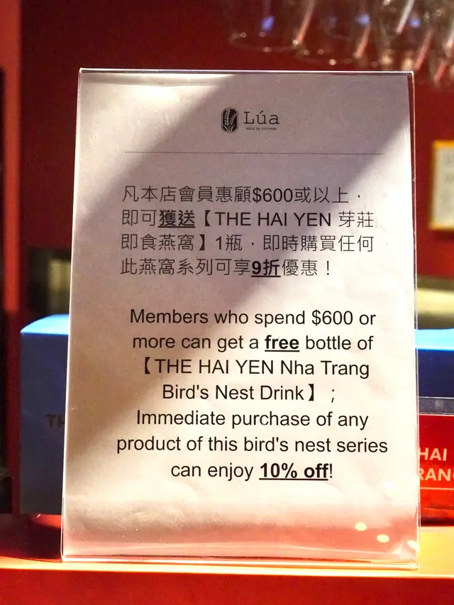 🎁 點餐後店員送上The Hai Yen 芽莊即食燕窩1樽,原來會員惠顧滿HKD600就啦,即刻登記都得~ (送完即止,即時購買仲有9折)