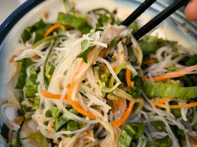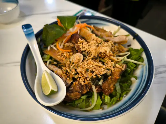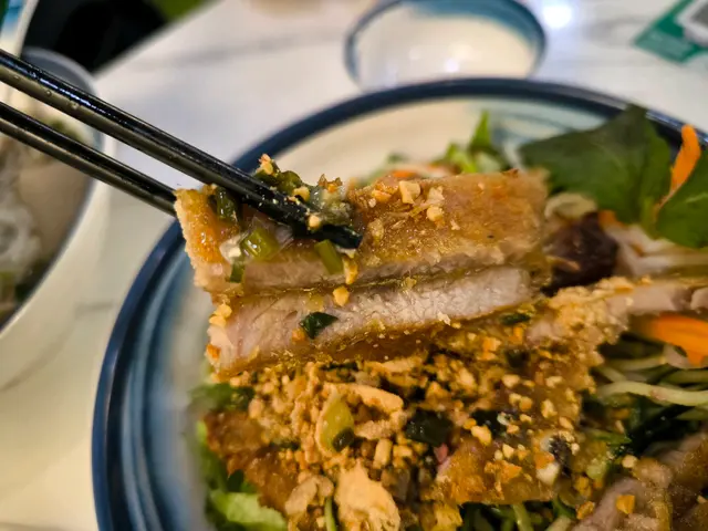 套餐主食,香茅豬扒撈檬,沒想到撈檬一樣大大碗,檬內生菜絲、蘿蔔絲、青瓜絲如此多,加上酸汁帶點微辣很開胃。香茅豬扒都大塊,味道都不錯。