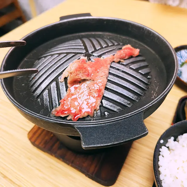 我那個牛小排油脂蠻多的,所以即烤的時候有很多油份不停滴出來,幸好這個有點像韓燒的圓形烤爐設計,烤盤的中心點高,周邊底,所以烤牛肉時,油份會斜落到下邊,吃的時候就比較健康。但要留意烤的時候,油還是會彈出到爐的外邊,而且是非常多,吃完後周圍都是油。