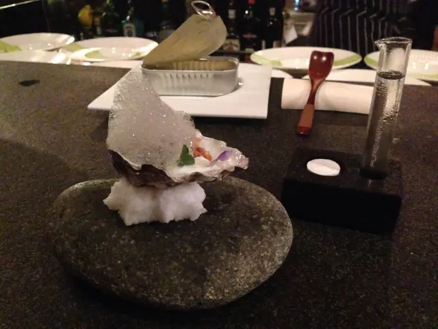 來自南非的鮮蠔放置於一石春上,頗有台型,新鮮嫩滑,雖然並非特別肥美;蓋面的氣泡亦是蠔汁製造,配以炸至香脆的豆粒(snap peas)及柚子汁,口感有脆滑酸鮮之層次。