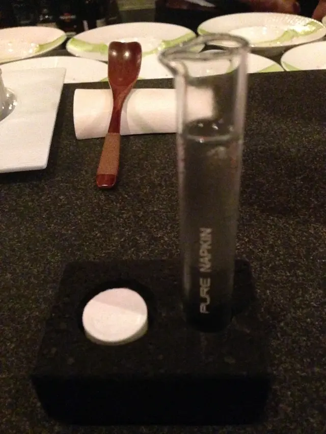 原來是要把試管內之水倒在旁邊之白色粒子上,它就會澎脹升起,之後拿起打開便可作濕紙巾用。我猜,概念是否來自海鮮酒家送上的檸檬茶,用意吃罷蝦蟹後洗手呢?這兒的目的相若,讓客人吃蠔之前後抹抹手,及以napkin 其香薰喚醒味蕾。