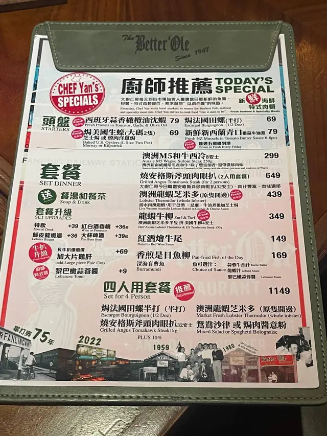 估唔到粉嶺都有正宗嘅懷舊英式酒吧 VictoriaTam1222等級42025-01-151K 瀏覽 關注 最近我去了一家歷史悠久的西餐廳,位於粉嶺和豐街的畢打奧餐廳。自1947年開業以來,它已經走過了77個年頭,成為香港具代表性的英式酒吧西餐廳之一。走進餐廳,彷彿穿越回上世紀的香港。牆上掛滿了懷舊的照片和紀念品,營造出一種溫馨而懷舊的氛圍。雖然環境充滿歷史感,但卻不顯得陳舊,整體佈置簡約舒適,非常適合約會或慶祝特殊日子。服務員的熱情周到,讓人感到賓至如歸。😋澳洲M5和牛西冷 $299👍🏻這道菜選用了來自澳洲新南威爾斯的西冷,肉質滑嫩多汁,經過五分熟的精緻烹調,肉香四溢。搭配簡單的燒汁,更能突顯肉質的原味。如果想要升級享受,還可以加$69品嚐到鵝肝。❤️焗法國田螺(半打)$69這道傳統的香港西餐廳菜式以蒜蓉牛油醬焗製而成。每一口田螺都鮮嫩彈牙,搭配柔滑的薯蓉,香濃的蒜香撲鼻而來,令人回味無窮。941以上食評乃用戶個人意見 , 並不代表OpenRice之觀點。讚好分享估唔到粉嶺都有正宗嘅懷舊英式酒吧 畢打奧餐廳 https://s.openrice.com/QrbT0KvLP00檢舉 張貼 評分4味道4環境4服務4衛生5抵食用餐途徑堂食