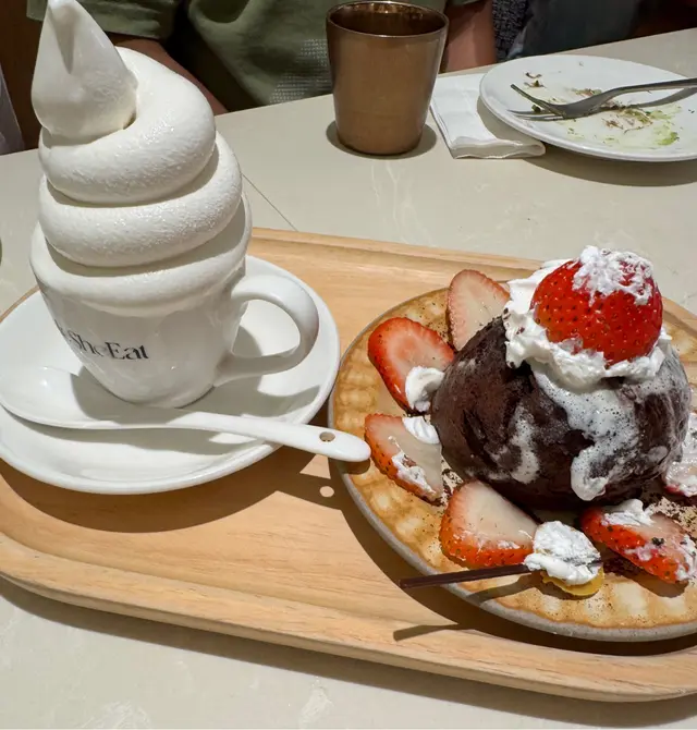 賣相吸引,朱古力心太軟味道極之濃郁,一切開即有朱古力醬流出。旁邊白色茶杯配雲呢拿味雪糕,冷熱交融,質素極佳。