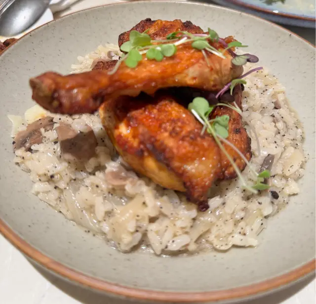 燒春雞體積迷你,但肉質不堅韌,仍然嫰滑,一切開已有大量肉汁流出來,外皮有燒汁的調味。意大利飯外軟內硬,沾滿了黑松露汁。