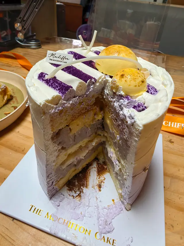 這款「芋泥焦糖布蕾」蛋糕,猶如一場在舌尖優雅上演的法式甜點交響曲。頂層輕敲即碎的焦糖脆片,伴隨香滑牛奶忌廉在口中溫柔化開,宛如絲絨帷幕緩緩拉開。內層藏著令人驚喜的靈魂主角——綿密新鮮芋泥,與招牌軟糯麻薯纏綿交疊,每一啖都能感受芋香在蛋香蛋糕的襯托下層層綻放。當布蕾的焦香、芋泥的醇厚與麻薯的Q彈在味蕾共舞,瞬間將平凡的午後點綣昇華成充滿幸福感的味覺盛宴。