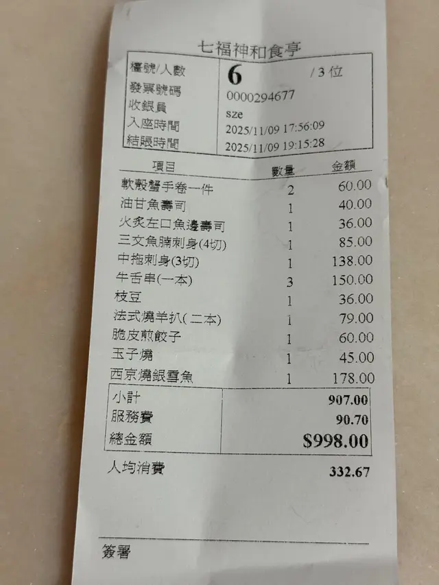 佐敦日式料理好去處🍴 Karenkyt等級42025-11-1064 瀏覽 關注 之前去過呢間居酒屋食dinner就已經bookmark咗要再嚟!呢度環境舒適, 食物種類多而且質素高, 主要提供刺身、壽司🍣、一品料理、清酒🍶, 價錢合理, 係佐敦食日式料理嘅好去處🍴𓌉◯𓇋 ︎三文魚腩、中拖羅 厚切三文魚腩刺身充滿魚油香, 油脂豐厚, 超肥美!中拖羅魚油甘香, 味道鮮美!𓌉◯𓇋 ︎玉子燒 口感滑嫩, 帶有甜甜嘅蛋香~🍣 火炙左口魚邊壽司、油甘魚壽司 、軟殼蟹手卷火炙左口魚邊好肥美, 炙燒過逼出魚油;油甘魚滑嫩;手卷嘅軟殼蟹炸得夠脆𓌉◯𓇋 ︎牛舌芯串 每一粒都好爽彈, 調味啱啱好👍🏻 🐟 西京燒銀鱈魚魚皮煎至焦脆, 魚肉嫩滑, 食落有味噌醬油味同豐富嘅魚油香, 醬油甜甜的, 好滋味! 𓌉◯𓇋 ︎法式燒羊扒 熟度剛好, 啖啖肉, 羊肉味香濃以上食評乃用戶個人意見 , 並不代表OpenRice之觀點。讚好分享佐敦日式料理好去處🍴 七福神和食亭 https://s.openrice.com/QrbT0iYDV00檢舉 張貼 評分5味道4環境4服務4衛生4抵食用餐日期2025-11-09用餐途徑堂食人均消費$330 (晚餐)